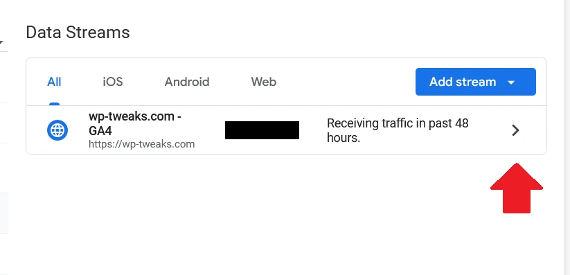 Next, you’ll get a list of data streams for your site. If you’re like most people, you have just one. Click to expand it: